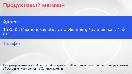 Продуктовый магазин по адресу 153032, Ивановская область, Иваново, Лежневская, 152 ст1 в дальнейшем Организация, размещена в следующих категориях: