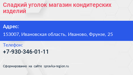 Сладкий уголок, магазин кондитерских изделий по адресу 153007, Ивановская область, Иваново, Фрунзе, 25 в дальнейшем Организация, размещена в следующих категориях: