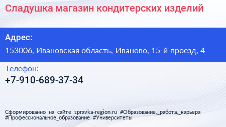 Сладушка, магазин кондитерских изделий по адресу 153006, Ивановская область, Иваново, 15-й проезд, 4 в дальнейшем Организация, размещена в следующих категориях: