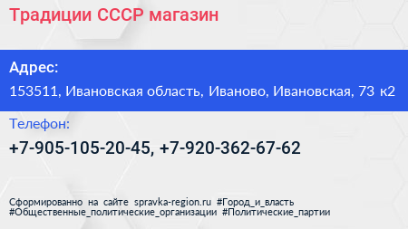 Традиции СССР, магазин по адресу 153511, Ивановская область, Иваново, Ивановская, 73 к2 в дальнейшем Организация, размещена в следующих категориях: