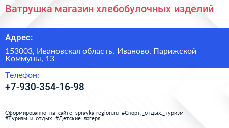 Ватрушка, магазин хлебобулочных изделий по адресу 153003, Ивановская область, Иваново, Парижской Коммуны, 13 в дальнейшем Организация, размещена в следующих категориях: