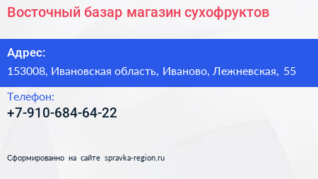 Восточный базар, магазин сухофруктов по адресу 153008, Ивановская область, Иваново, Лежневская, 55 в дальнейшем Организация, размещена в следующих категориях: