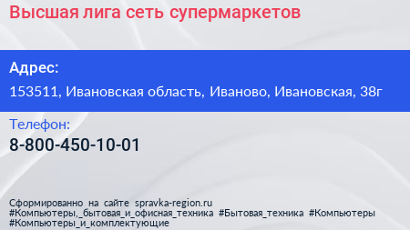 Высшая лига, сеть супермаркетов по адресу 153511, Ивановская область, Иваново, Ивановская, 38г в дальнейшем Организация, размещена в следующих категориях: