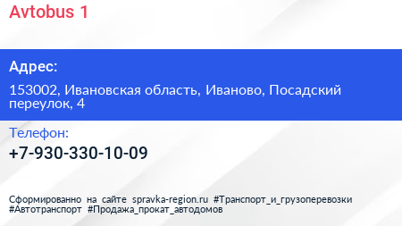 Avtobus 1 по адресу 153002, Ивановская область, Иваново, Посадский переулок, 4 в дальнейшем Организация, размещена в следующих категориях: