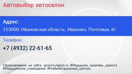 Автовыбор, автосалон по адресу 153000, Ивановская область, Иваново, Почтовая, 6г в дальнейшем Организация, размещена в следующих категориях:
