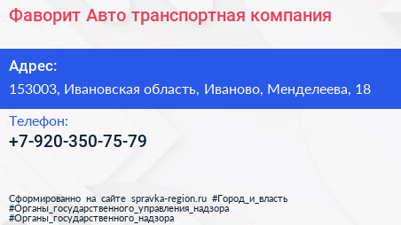 Фаворит Авто, транспортная компания по адресу 153003, Ивановская область, Иваново, Менделеева, 18 в дальнейшем Организация, размещена в следующих категориях: