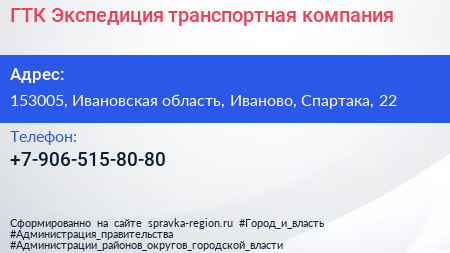 ГТК-Экспедиция, транспортная компания по адресу 153005, Ивановская область, Иваново, Спартака, 22 в дальнейшем Организация, размещена в следующих категориях: