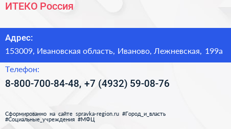 ИТЕКО Россия по адресу 153009, Ивановская область, Иваново, Лежневская, 199а в дальнейшем Организация, размещена в следующих категориях: