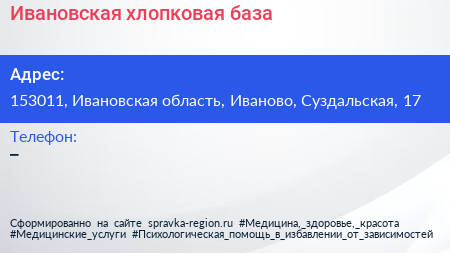 Ивановская хлопковая база по адресу 153011, Ивановская область, Иваново, Суздальская, 17 в дальнейшем Организация, размещена в следующих категориях:
