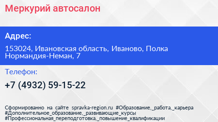 Меркурий, автосалон по адресу 153024, Ивановская область, Иваново, Полка Нормандия-Неман, 7 в дальнейшем Организация, размещена в следующих категориях: