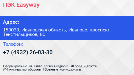 ПЭК: Easyway по адресу 153038, Ивановская область, Иваново, проспект Текстильщиков, 80 в дальнейшем Организация, размещена в следующих категориях: