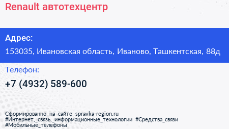 Renault, автотехцентр по адресу 153035, Ивановская область, Иваново, Ташкентская, 88д в дальнейшем Организация, размещена в следующих категориях:
