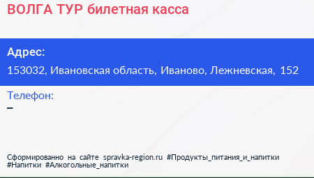 ВОЛГА ТУР, билетная касса по адресу 153032, Ивановская область, Иваново, Лежневская, 152 в дальнейшем Организация, размещена в следующих категориях: