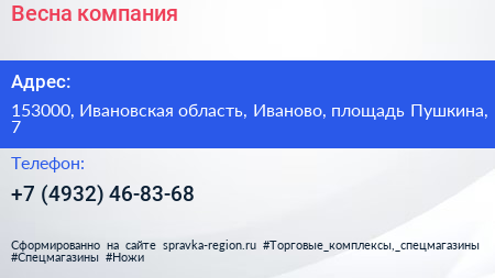 Весна, компания по адресу 153000, Ивановская область, Иваново, площадь Пушкина, 7 в дальнейшем Организация, размещена в следующих категориях: