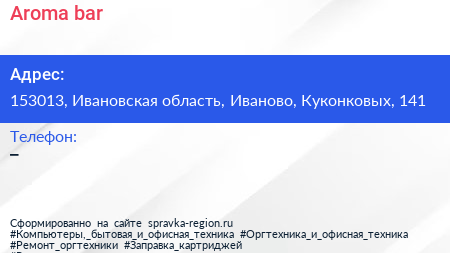 Aroma bar по адресу 153013, Ивановская область, Иваново, Куконковых, 141 в дальнейшем Организация, размещена в следующих категориях: