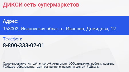 ДИКСИ, сеть супермаркетов по адресу 153002, Ивановская область, Иваново, Демидова, 12 в дальнейшем Организация, размещена в следующих категориях: