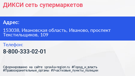 ДИКСИ, сеть супермаркетов по адресу 153038, Ивановская область, Иваново, проспект Текстильщиков, 109 в дальнейшем Организация, размещена в следующих категориях: