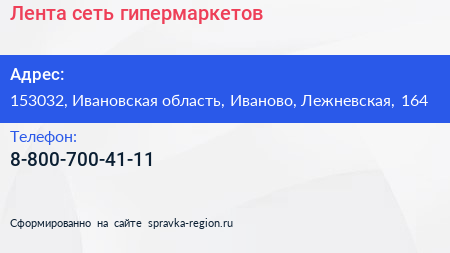 Лента, сеть гипермаркетов по адресу 153032, Ивановская область, Иваново, Лежневская, 164 в дальнейшем Организация, размещена в следующих категориях: