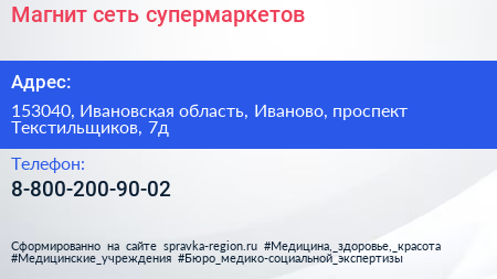Магнит, сеть супермаркетов по адресу 153040, Ивановская область, Иваново, проспект Текстильщиков, 7д в дальнейшем Организация, размещена в следующих категориях: