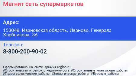 Магнит, сеть супермаркетов по адресу 153048, Ивановская область, Иваново, Генерала Хлебникова, 36 в дальнейшем Организация, размещена в следующих категориях: