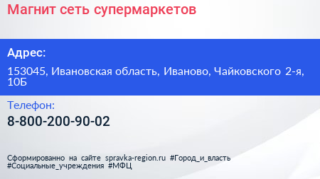 Магнит, сеть супермаркетов по адресу 153045, Ивановская область, Иваново, Чайковского 2-я, 10Б в дальнейшем Организация, размещена в следующих категориях:
