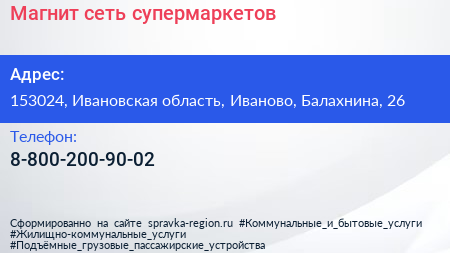 Магнит, сеть супермаркетов по адресу 153024, Ивановская область, Иваново, Балахнина, 26 в дальнейшем Организация, размещена в следующих категориях: