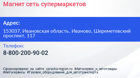 Магнит, сеть супермаркетов по адресу 153037, Ивановская область, Иваново, Шереметевский проспект, 117 в дальнейшем Организация, размещена в следующих категориях:
