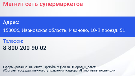 Магнит, сеть супермаркетов по адресу 153006, Ивановская область, Иваново, 10-й проезд, 51 в дальнейшем Организация, размещена в следующих категориях: