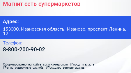 Магнит, сеть супермаркетов по адресу 153000, Ивановская область, Иваново, проспект Ленина, 12 в дальнейшем Организация, размещена в следующих категориях: