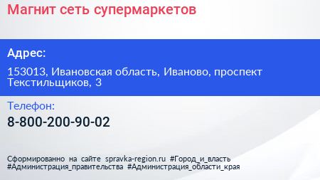 Магнит, сеть супермаркетов по адресу 153013, Ивановская область, Иваново, проспект Текстильщиков, 3 в дальнейшем Организация, размещена в следующих категориях: