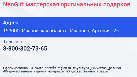 NeoGift, мастерская оригинальных подарков по адресу 153000, Ивановская область, Иваново, Арсения, 25 в дальнейшем Организация, размещена в следующих категориях: