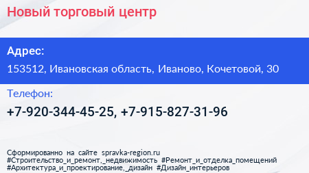 Новый, торговый центр по адресу 153512, Ивановская область, Иваново, Кочетовой, 30 в дальнейшем Организация, размещена в следующих категориях: