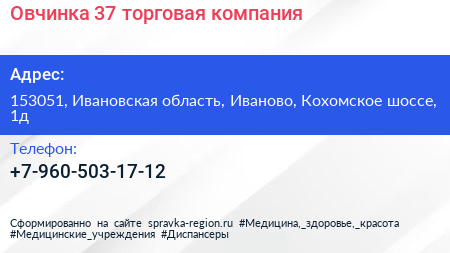 Овчинка 37, торговая компания по адресу 153051, Ивановская область, Иваново, Кохомское шоссе, 1д в дальнейшем Организация, размещена в следующих категориях: