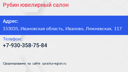Рубин, ювелирный салон по адресу 153035, Ивановская область, Иваново, Лежневская, 117 в дальнейшем Организация, размещена в следующих категориях: