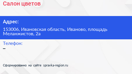 Салон цветов по адресу 153006, Ивановская область, Иваново, площадь Меланжистов, 2а в дальнейшем Организация, размещена в следующих категориях: