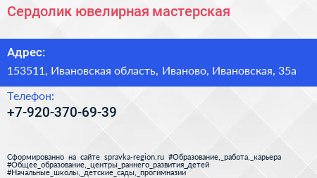 Сердолик, ювелирная мастерская по адресу 153511, Ивановская область, Иваново, Ивановская, 35а в дальнейшем Организация, размещена в следующих категориях: