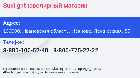 Sunlight, ювелирный магазин по адресу 153008, Ивановская область, Иваново, Лежневская, 55 в дальнейшем Организация, размещена в следующих категориях: