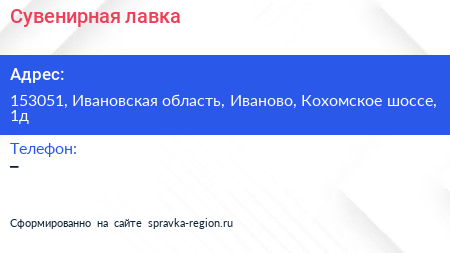 Сувенирная лавка по адресу 153051, Ивановская область, Иваново, Кохомское шоссе, 1д в дальнейшем Организация, размещена в следующих категориях: