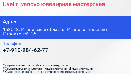 Uvelir Ivanovo, ювелирная мастерская по адресу 153048, Ивановская область, Иваново, проспект Строителей, 35 в дальнейшем Организация, размещена в следующих категориях: