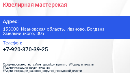 Ювелирная мастерская по адресу 153000, Ивановская область, Иваново, Богдана Хмельницкого, 30а в дальнейшем Организация, размещена в следующих категориях:
