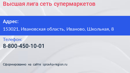 Высшая лига, сеть супермаркетов по адресу 153021, Ивановская область, Иваново, Школьная, 8 в дальнейшем Организация, размещена в следующих категориях:
