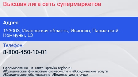 Высшая лига, сеть супермаркетов по адресу 153003, Ивановская область, Иваново, Парижской Коммуны, 13 в дальнейшем Организация, размещена в следующих категориях:
