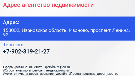 Адрес, агентство недвижимости по адресу 153002, Ивановская область, Иваново, проспект Ленина, 92 в дальнейшем Организация, размещена в следующих категориях: