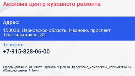 Аксиома, центр кузовного ремонта по адресу 153038, Ивановская область, Иваново, проспект Текстильщиков, 82 в дальнейшем Организация, размещена в следующих категориях: