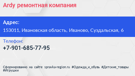 Ardy, ремонтная компания по адресу 153011, Ивановская область, Иваново, Суздальская, 6 в дальнейшем Организация, размещена в следующих категориях: