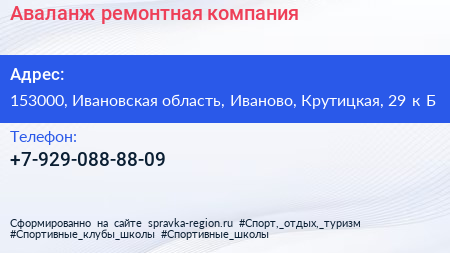 Аваланж, ремонтная компания по адресу 153000, Ивановская область, Иваново, Крутицкая, 29 к Б в дальнейшем Организация, размещена в следующих категориях:
