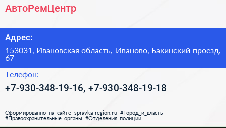 АвтоРемЦентр по адресу 153031, Ивановская область, Иваново, Бакинский проезд, 67 в дальнейшем Организация, размещена в следующих категориях: