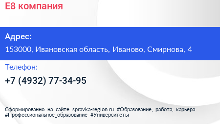 Е8, компания по адресу 153000, Ивановская область, Иваново, Смирнова, 4 в дальнейшем Организация, размещена в следующих категориях: