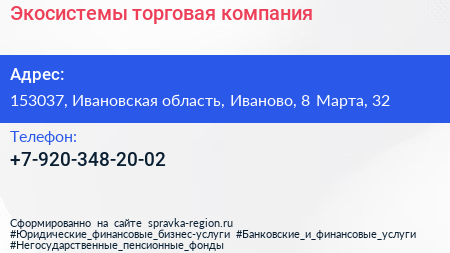 Экосистемы, торговая компания по адресу 153037, Ивановская область, Иваново, 8 Марта, 32 в дальнейшем Организация, размещена в следующих категориях: