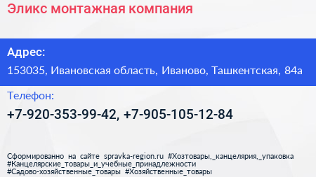 Эликс, монтажная компания по адресу 153035, Ивановская область, Иваново, Ташкентская, 84а в дальнейшем Организация, размещена в следующих категориях: